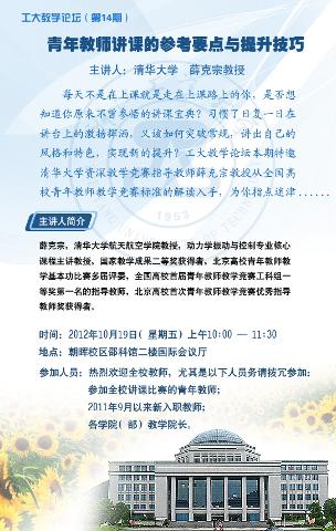 主講人:清華大學薛克宗教授 時 間:10月19日上午10:00-11:30 地 點:朝暉校區邵科館二樓國際會議廳