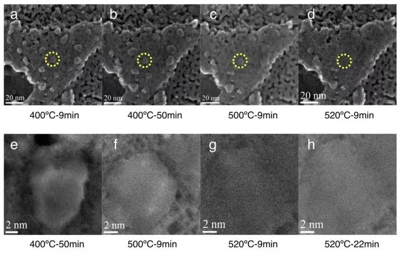 實(shí)驗(yàn)結(jié)果和林麗利預(yù)想的完全一致。鎳納米粒子在高溫?cái)_動(dòng)下自發(fā)地在氮化鉬表面逐漸由3D 結(jié)構(gòu)向 2D薄層粒子轉(zhuǎn)變。也就是說,氮化鉬在高溫下抑制金屬燒結(jié)的同時(shí),還能將金屬粒子撕裂鋪展浸潤,實(shí)現(xiàn)逆燒結(jié)。