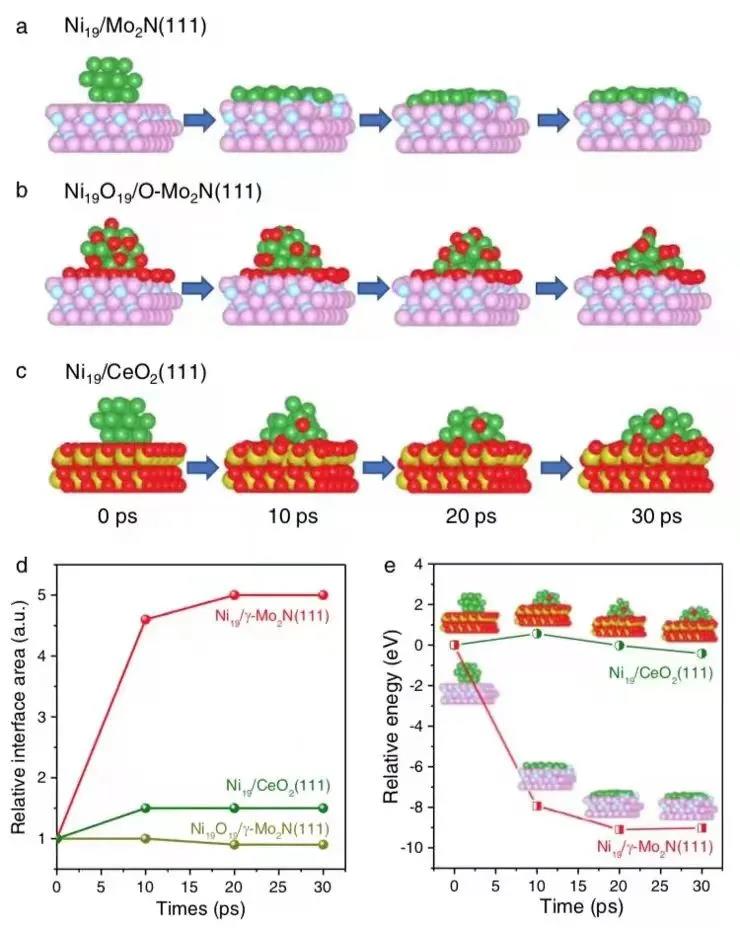 根據(jù)理論計(jì)算和動(dòng)力學(xué)模擬,林麗利發(fā)現(xiàn)在鎳與氮化鉬的強(qiáng)相互作用下,3D金屬鎳顆粒可以自發(fā)地在還原的氮化鉬表面分散成 2D 的片狀結(jié)構(gòu)。