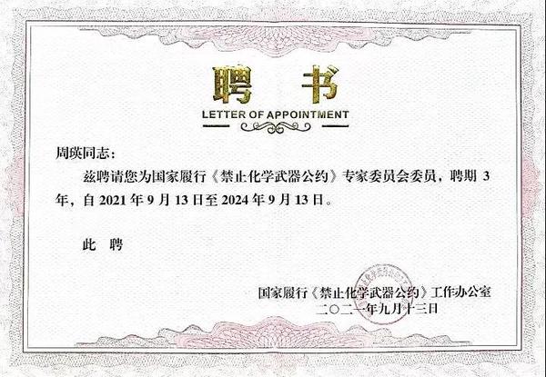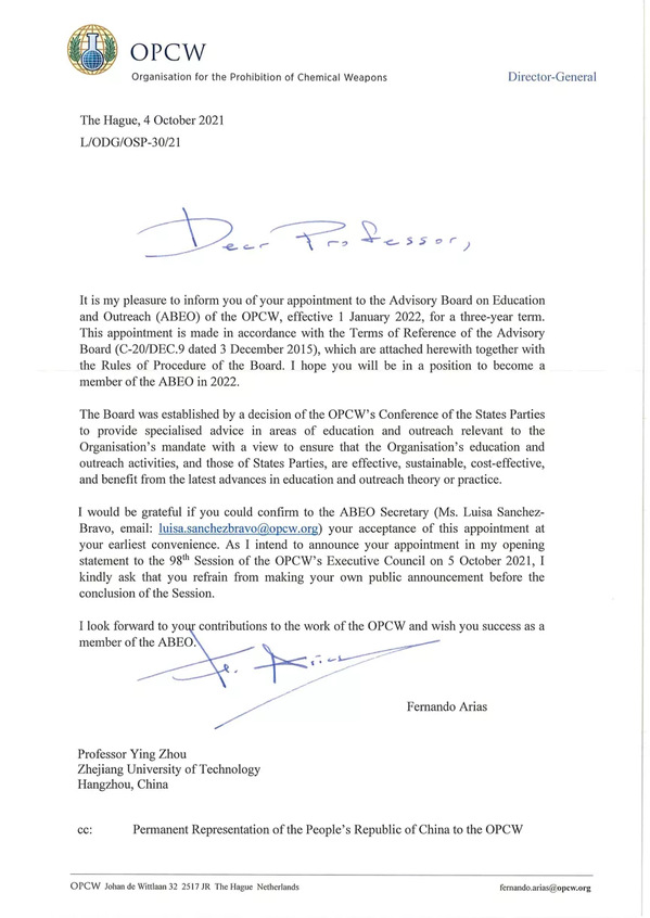本月,禁止化學武器組織總干事費爾南多?阿里亞斯(Fernando Arias Gonzalez)簽發任命書,任命我校周瑛教授為“禁止化學武器組織教育和外聯咨詢委員會”委員,任期從2022年1月1日開始,為期三年。該任命書同時抄送我國常駐禁止化學武器組織代表。