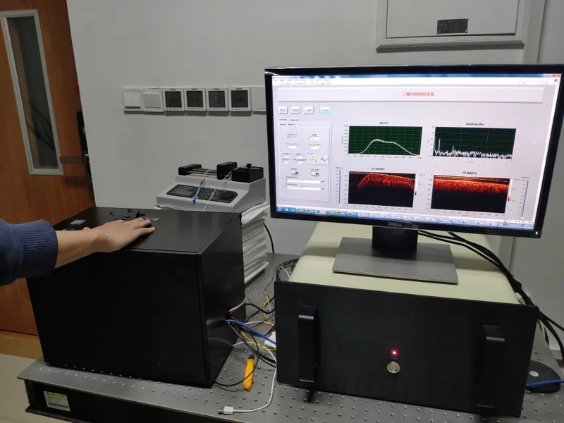 值得一提的是,該系統(tǒng)采用小光斑光纖準(zhǔn)直器和長焦透鏡保證光學(xué)相干層析成像有足夠的面積,采用自制的梯形棱鏡組合TIR和OCT光路,實現(xiàn)相同的測量面積和同步采集。
