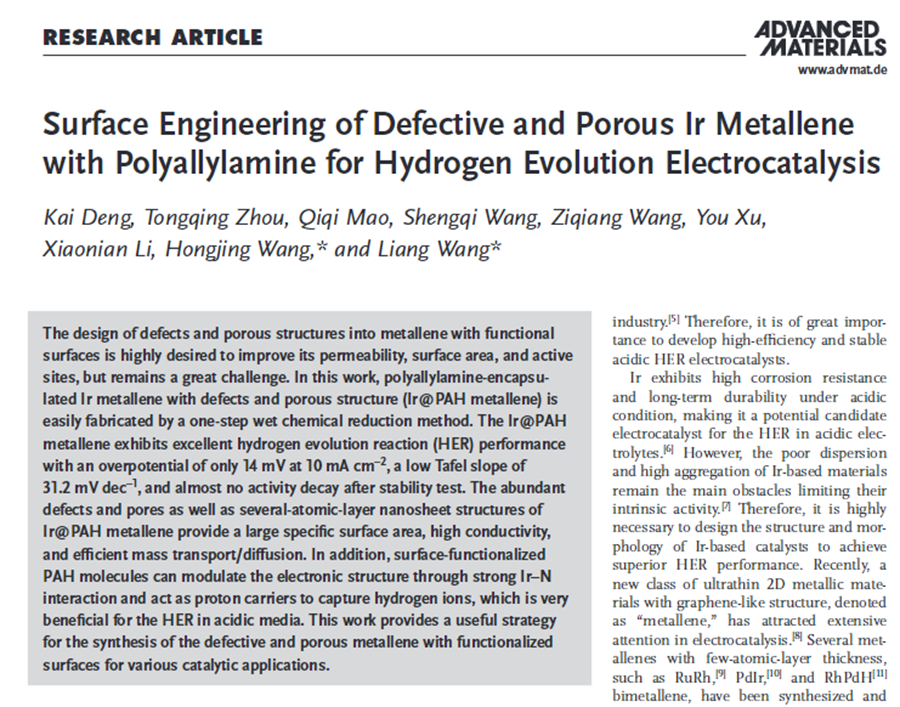 近日,我校王亮教授團隊提出了一步化學還原直接制備聚(丙烯胺鹽酸鹽)(PAH)表面功能化的富缺陷和多孔Ir金屬烯(Ir@PAH)的合成方法,并應用于電催化酸性析氫反應。該成果以“Surface Engineering of Defective and Porous Ir Metallene with Polyallylamine for Hydrogen Evolution Electrocatalysis”為題,于2022年3月8日被《Advanced Materials》在線報道。