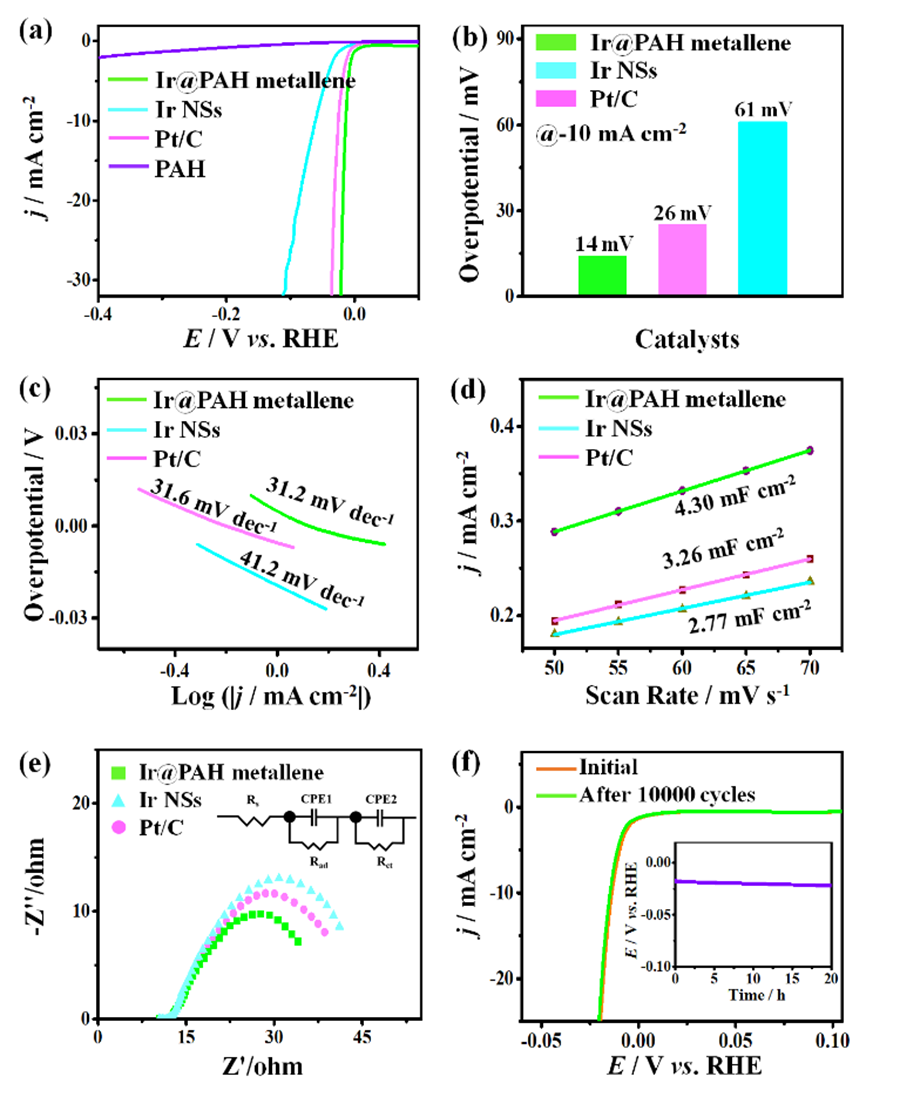 浙江工業大學王亮教授團隊長期致力于能源電催化研究領域。該工作通過表面功能化修飾有效地提高了Ir金屬烯的電催化活性和穩定性。獨特的富缺陷和多孔二維超薄納米片結構賦予了Ir@PAH大的比表面積、高導電性和優異的質量傳輸/擴散能力。并且,表面功能化的PAH分子可以通過強的Ir-N相互作用來調節電子結構,并作為質子載體有效地捕獲水合氫離子中的H+以形成富含質子的中間體。獨特的金屬烯結構和Ir-PAH界面的優勢使Ir@PAH具有優異的電催化析氫性能。在10 mA cm-2電流密度下的過電位僅為14 mV,Tafel斜率低至31.2 mV dec-1,穩定性測試后幾乎沒有活性衰減。該研究工作為電解水制氫提供了高效的電催化劑。