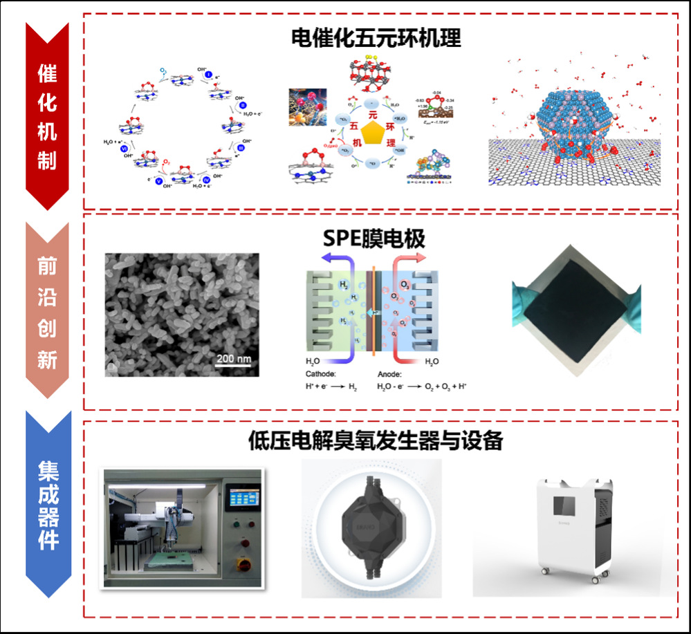 基于穩定的“動態活性位”思路,進一步設計開發了少鉛及非鉛陽極電催化劑(圖1)。從熱力學角度揭示電解水產臭氧過程氧中間體在電催化劑表界面O?/O?吸附競爭機制,解決中性條件工業大電流密度下SPE電解水產臭氧發生器法拉第效率低的問題。從動力學角度揭示低壓電解臭氧發生器運行過程大電流密度下三維多孔結構調控傳質傳熱機制,解決SPE電解水產臭氧發生器散熱問題。同時優化SPE低壓電解臭氧器核心膜電極批量化制備工藝流程,開發新型高性能陰/陽極催化劑,取得了產業化關鍵技術突破。該新型無鉛電解臭氧發生器完全符合RoHS規定,產品可廣泛應用于工業、醫療、家電等領域。