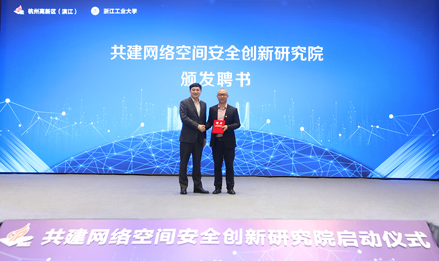 鄭迪為濱江區(qū)浙工大網(wǎng)絡(luò)空間安全創(chuàng)新研究院院長(zhǎng)宣琦頒發(fā)聘書(shū)。