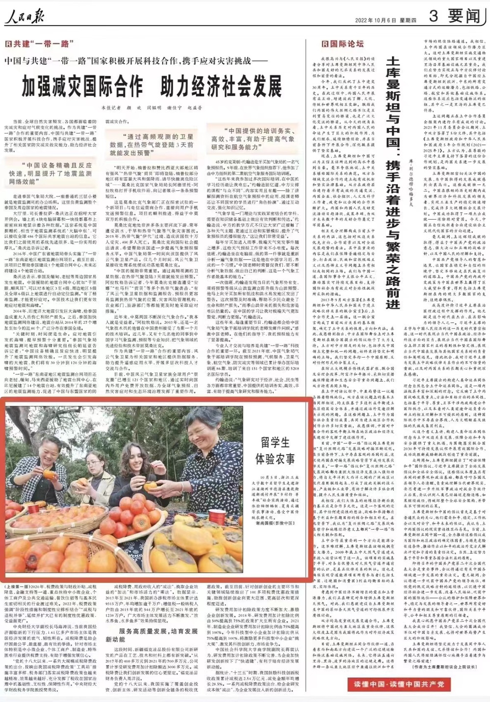 10月6日,《人民日報》以《留學生體驗農事》為題,報道我校留學生走進浙江省湖州市德清縣康乾街道新琪村開展“鄉村行 享豐收”社會實踐活動,通過體驗柿餅曬制、菱角等農事活動,感受中國傳統農耕文化。