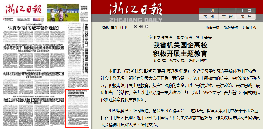 4月11日,《浙江日?qǐng)?bào)》頭版以《突出學(xué)深悟透、感恩奮進(jìn)、實(shí)干爭(zhēng)先 我省機(jī)關(guān)國(guó)企高校積極開展主題教育》為標(biāo)題,報(bào)道我校積極開展主題教育,推進(jìn)調(diào)查研究相關(guān)工作。
