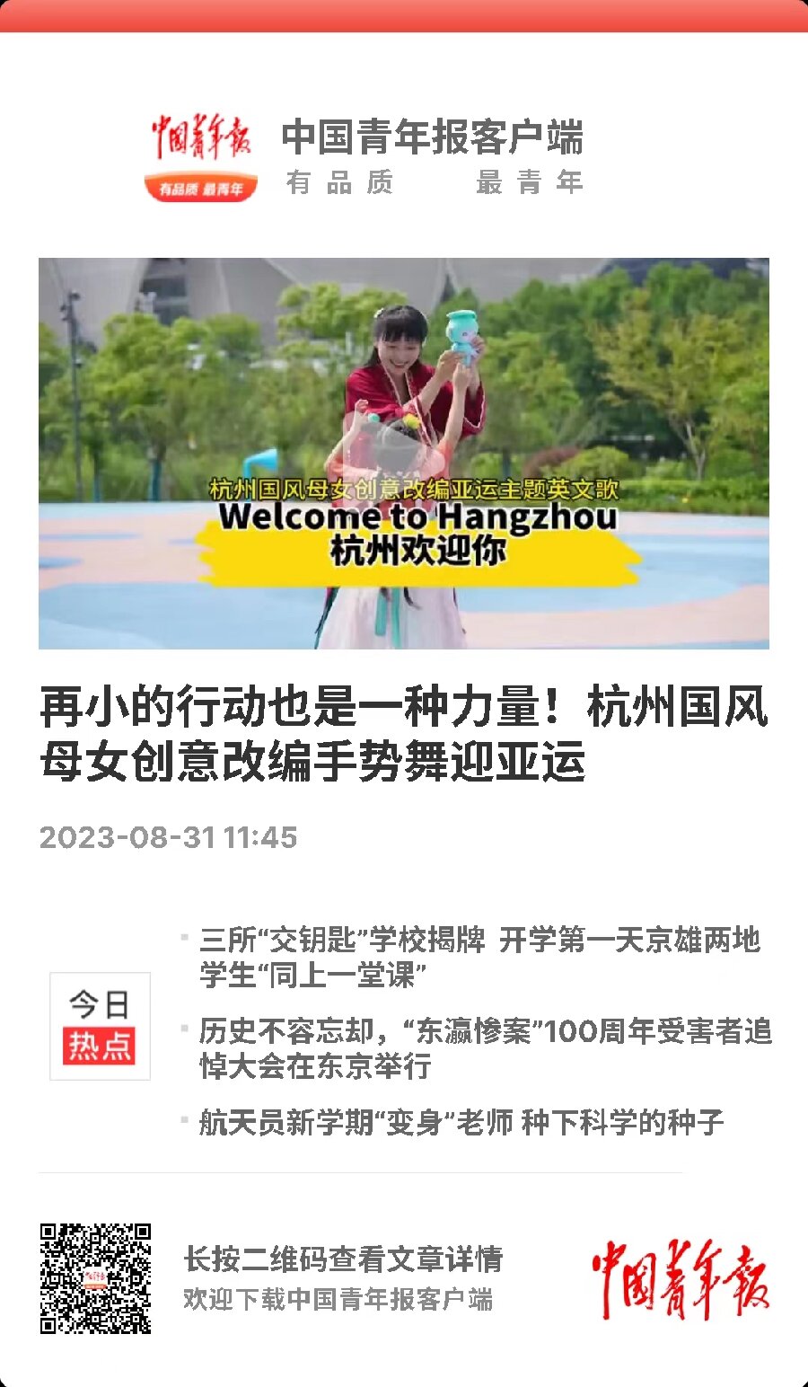 8月30日,中國青年報客戶端以《再小的行動也是一種力量!杭州國風母女創意改編手勢舞迎亞運》為主題,報道了人文學院教師秦一創意改編亞運主題歌,創新手勢舞迎接亞運到來。