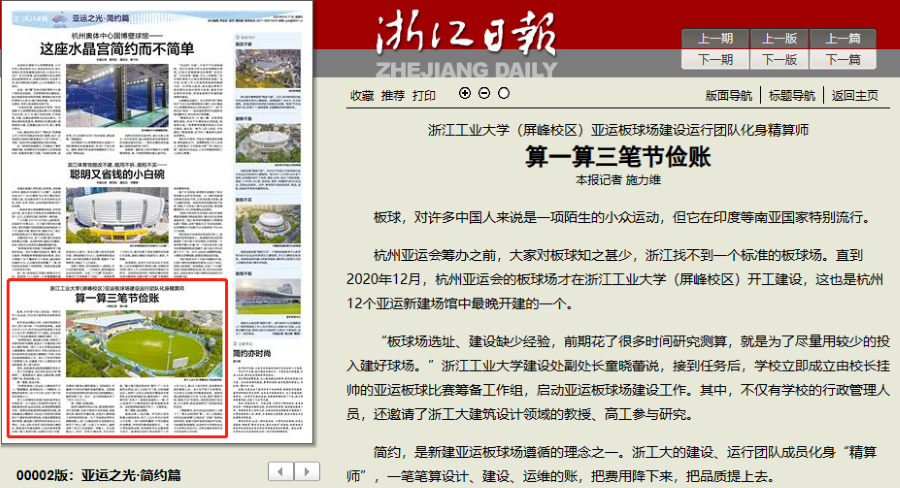 9月17日,《浙江日報》二版以《浙江工業大學(屏峰校區)亞運板球場建設運行團隊化身精算師 算一算三筆節儉賬》為主題,詳細報道了我校亞運板球場簡約節儉的建設巧思。