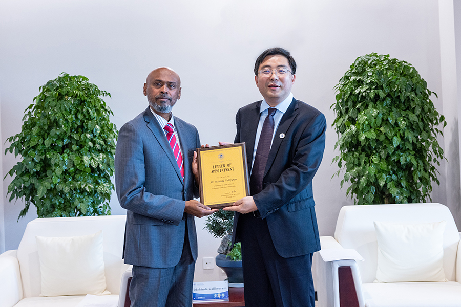 校長高翔為Mahinda Vallipuram先生頒發客座教授聘書并佩戴校徽。亞運會板球賽事總監Dinesh Muthuraman先生、板球賽事技術代表Prabhakaran Thanraj先生、副校長金曉明、國家體育總局小球中心相關負責人、學校相關職能部門負責人、志愿者代表參加聘任儀式。