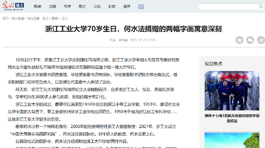 10月23日,光明網、《美術報》、潮新聞等多平臺以《浙江工業大學70歲生日,何水法捐贈的兩幅字畫寓意深刻》為主題,報道了何水法向我校捐贈書畫作品賀學校七十周年華誕。