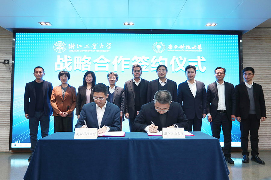 方紅衛和胡軍代表學校簽署《浙江工業大學-南方科技大學戰略合作備忘錄(2023-2028)》。