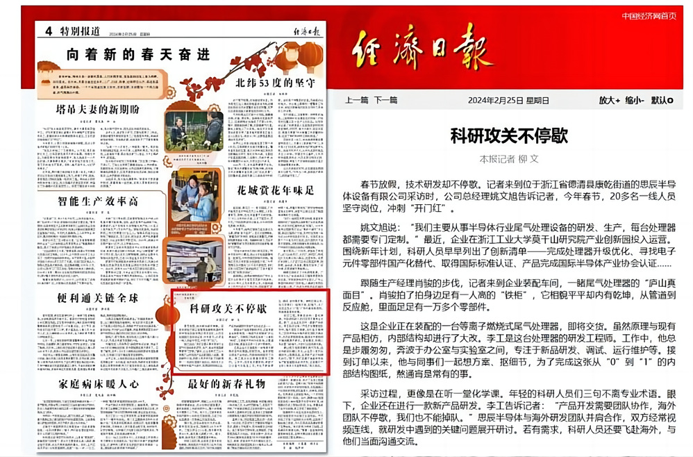 2月25日,《經濟日報》以《科研攻關不停歇》為題,報道我校莫干山研究院產業創新園春節期間一線人員堅守崗位,堅持技術研發工作。