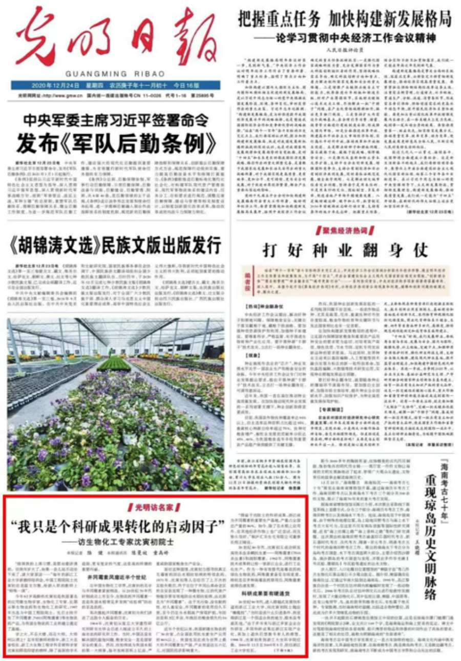 2020年12月24日,《光明日報》頭版專訪沈寅初院士