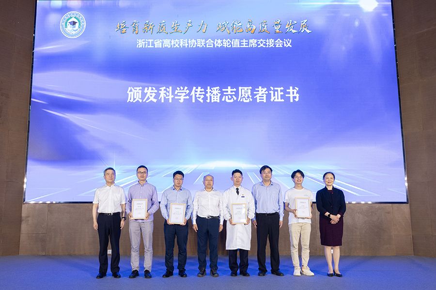 周國輝、高翔、曾肖芃、呂華共同啟動“十百千萬”科學傳播計劃,并為浙江工業大學材料科學與工程學院教授鄒世輝,浙江工業大學前沿交叉科學研究院青年教師、黃大年先進事跡報告團成員、浙江工業大學“青說青聽”青年科學家理論宣講團成員喬中坤,浙江大學醫學院研究生會主席、博士生報告團成員、浙江大學彩虹人生思政宣講團成員陳俊燃,浙江省“00后talker”宣講員、浙江工商職業技術學院“清風習習”宣講團成員杜海鵬等四位科學宣講員頒發科學傳播志愿者證書。