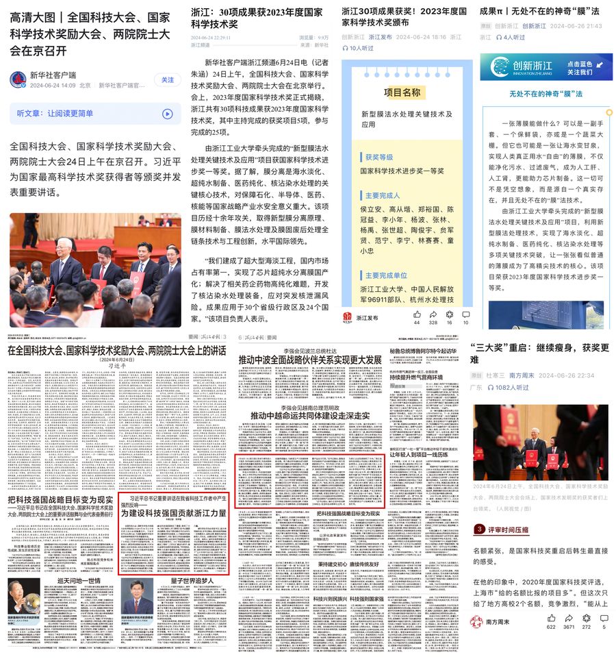 6月25日,《浙江日報》要聞版以《獲獎背后的長布局》為題報道浙江工業大學牽頭的“新型膜法水處理關鍵技術應用”項目獲得2023年度國家科技進步獎一等獎。
