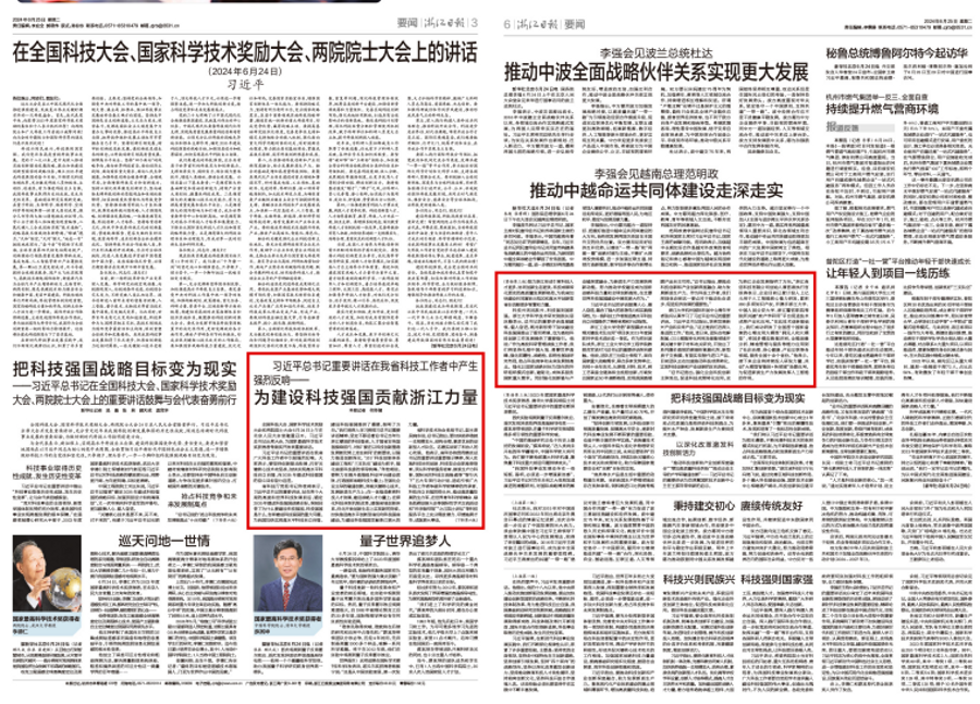 6月25日,《浙江日報》要聞版以《習近平總書記重要講話在我省科技工作者中產生強烈反響——為建設科技強國貢獻浙江力量》為題,采訪“新型膜法水處理關鍵技術及應用”項目團隊成員,浙江工業大學化學工程學院教授贠軍賢,他對習總書記的重要講話深有感觸:團隊在三位院士領銜下,面向國家重大戰略需求,聯合多家優勢單位,歷經十余年攻關,從原理、材料、技術,到工藝裝備全鏈條和全流程創新,打破發達國家近50年壟斷格局,實現我國高端膜產品自主可控。“總書記指出,要推動科技創新和產業創新深度融合,助力發展新質生產力。作為科技工作者,我們深刻體會到這一要點對于推動社會進步、促進經濟發展的重要性。”