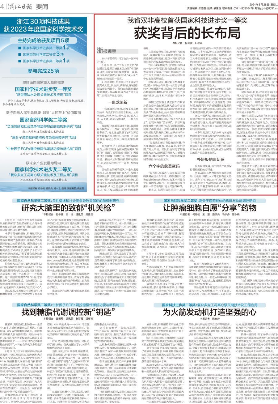 6月25日,《浙江日報》要聞版以《獲獎背后的長布局》為題報道浙江工業大學牽頭的“新型膜法水處理關鍵技術應用”項目獲得2023年度國家科技進步獎一等獎,報道指出,這支由侯立安、高從堦、鄭裕國院士領銜的團隊,十余年間迎難而上,從基礎理論入手,發明了超薄脫鹽膜、長效抗污膜、核素吸附膜3類核心材料,取得新型膜分離原理、膜材料制備、膜法水處理及膜固廢后處理全鏈條技術與工程創新,水平國際領先,打破了發達國家近50年的壟斷格局。