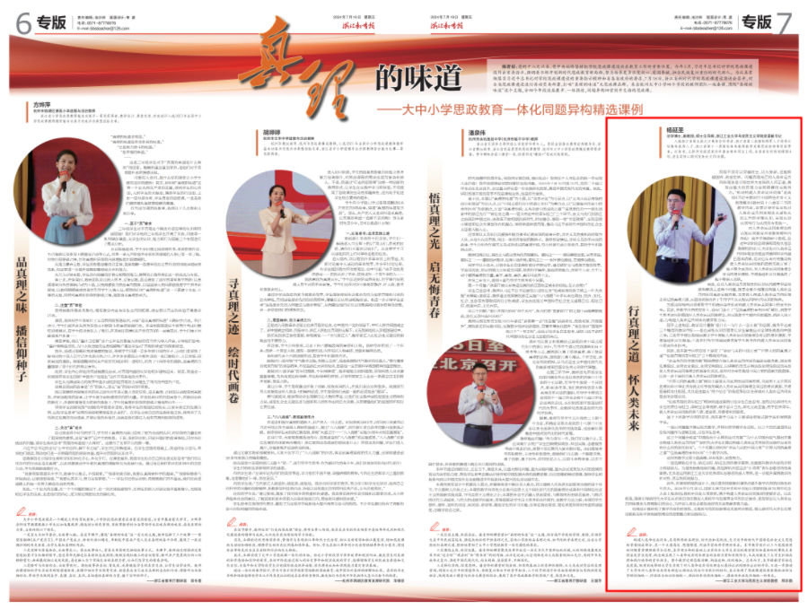 7月19日,《浙江教育報(bào)》專版第7版報(bào)道以《真理的味道》為主題,報(bào)道大中小學(xué)思政教育一體化同題異構(gòu)精選課例。
