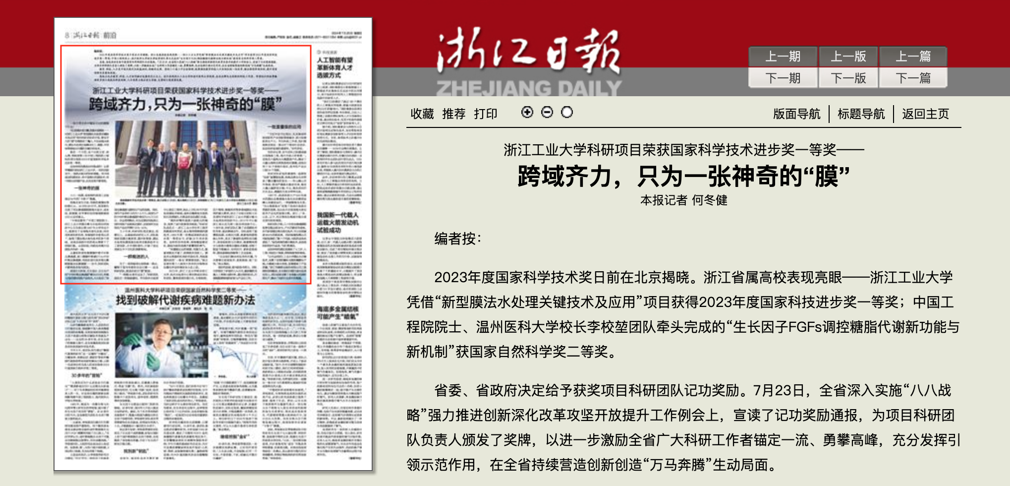 7月26日,《浙江日報》第8版以《跨域齊力,只為一張神奇的“膜”》為主題,報道我校“新型膜法水處理關鍵技術及應用”科研團隊。該團隊在7月23日召開的全省深入實施“八八戰略”強力推進創新深化改革攻堅開放提升工作例會上,受省委、省政府記功獎勵。