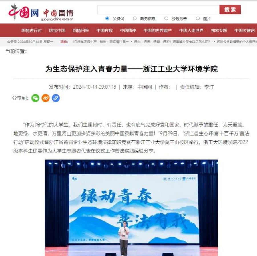 10月14日,中國網以《為生態保護注入青春力量——浙江工業大學環境學院》為題,報道了以環境學院2022級本科生徐雯等同學為代表的浙江工業大學綠色環保協會的同學們,二十六年如一日為生態保護貢獻青春力量。