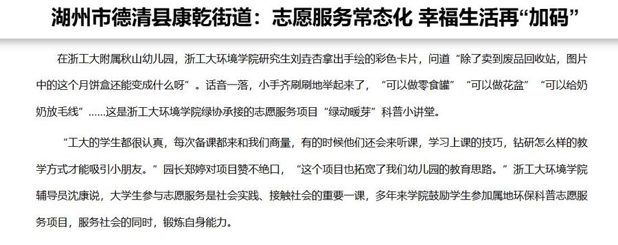 10月14日,新華網浙江以《湖州市德清縣康乾街道:志愿服務常態化 幸福生活再“加碼”》為題,報道了湖州市德清縣康乾街道聯合我校環境學院綠色環保協會、國際學院“洋哥”志愿服務隊,多年來有組織、有規模、制度化、常態化、專業化地服務社會,不斷延伸志愿服務觸角,健全志愿服務網絡,實現志愿服務精準觸達,為社會民眾幸福生活再“加碼”。