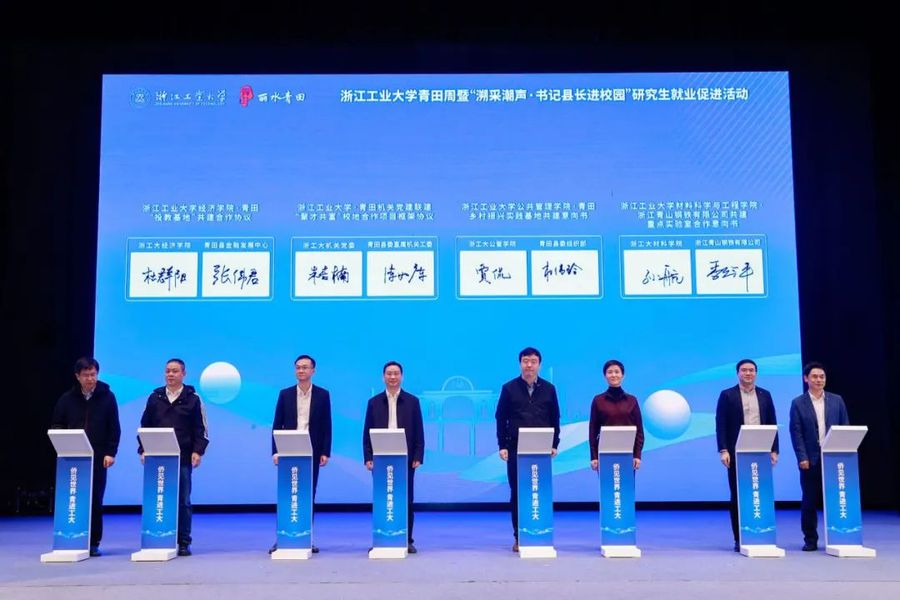 現場還舉行了引才工作站、青年駐村計劃工作站、校地科技成果轉化工作站等揭牌儀式,機關黨建聯建“聚才共富”校地合作項目、鄉村振興實踐基地、“投教基地”、共建重點實驗室等合作意向書簽訂儀式,以及“人才推薦官”、青春合伙人等聘任頒證儀式。青田縣現場發布了優秀研究生崗位鍛煉、青年駐村計劃、高層次和緊缺人才、“政聘企用”、優質企業等就業崗位。