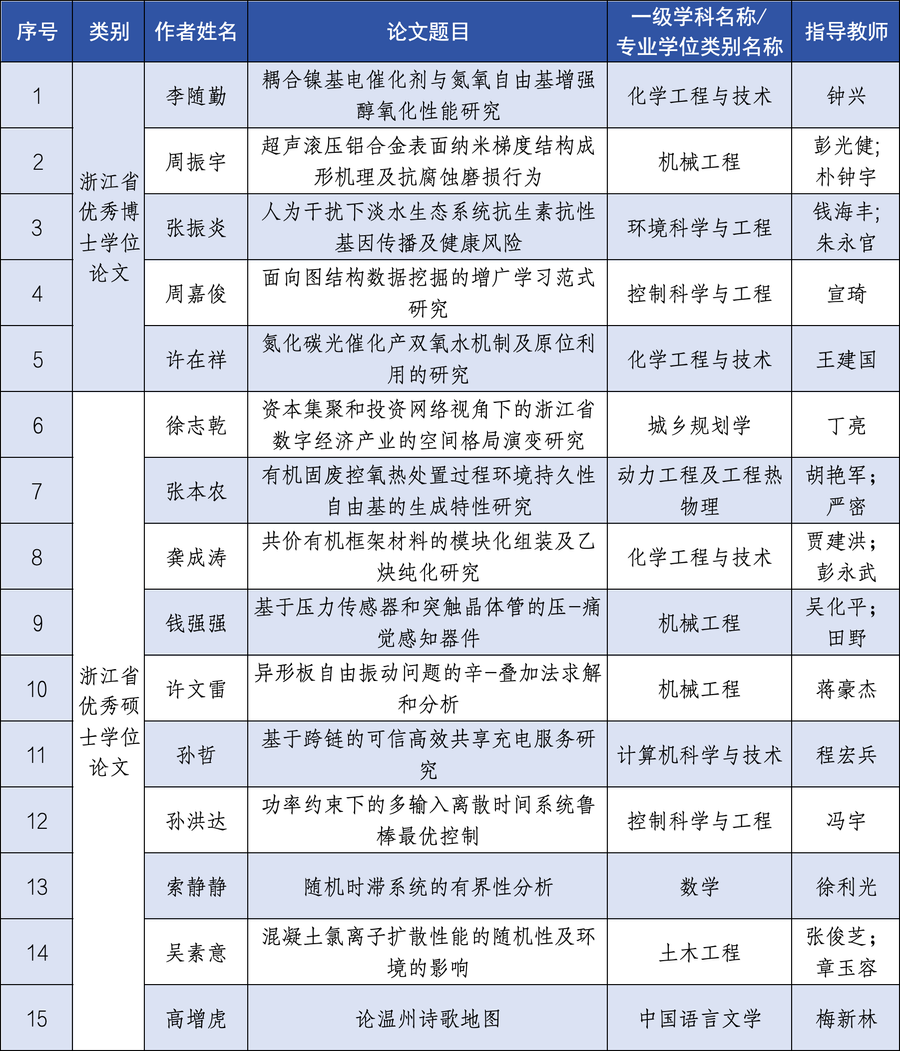 2023年浙江省優(yōu)秀博士學(xué)位論文和優(yōu)秀碩士學(xué)位論文名單