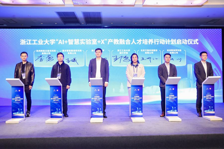 會上啟動了浙江工業大學“AI+智慧實驗室+X”教育行動計劃,我校與首批入選計劃的企業杭州網易云音樂科技有限公司、重慶智能建造研究院有限公司、北京萬集科技股份有限公司、杭州數知夢科技有限公司舉行簽約儀式。