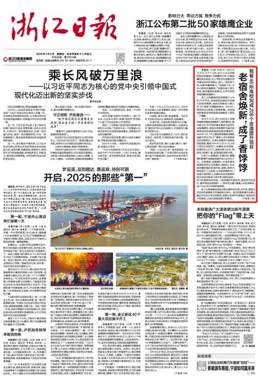 1月2日,《浙江日報》頭版以《老宿舍煥新,成了香餑餑——我省46所高校完成208個改造提升項目》為題,報道了浙工大朝暉校區尚德園宿舍樓經過大改造舊貌換新顏。