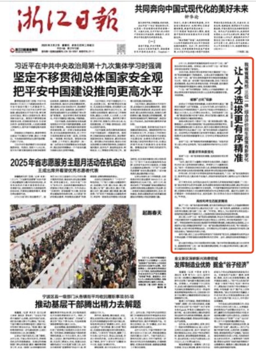 3月2日,《浙江日報》與潮新聞客戶端分別以《讓人才選拔更有序精準——我省省屬高校“三位一體”綜合評價招生政策有新變化》《浙江高校“三位一體”報名啟動!招生政策解讀及報考建議看這里》為題,報道我校啟動浙江省2025年省屬高校“三位一體”招生啟動。我校“三位一體”招生的初審改為“書面評審”的方式,根據考生的學業水平考試成績、中學階段綜合表現等材料先行評審,讓高校和考生匹配更精準。