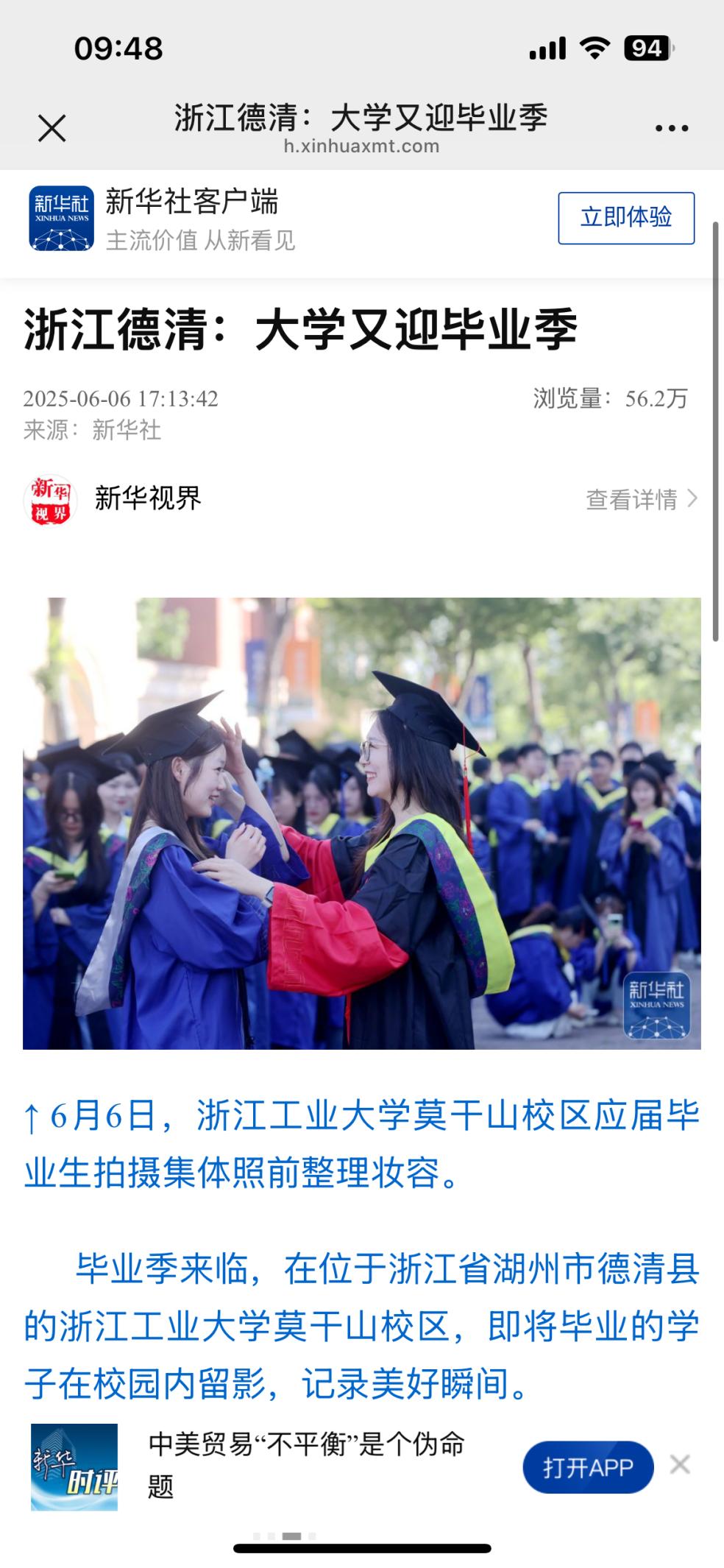 6 月 6 日,新華社客戶端、新華網(wǎng)、人民網(wǎng)等6家媒體報道浙江工業(yè)大學(xué)莫干山校區(qū)即將畢業(yè)的2857名學(xué)子在校園內(nèi)留影,記錄在母校的最后時光。