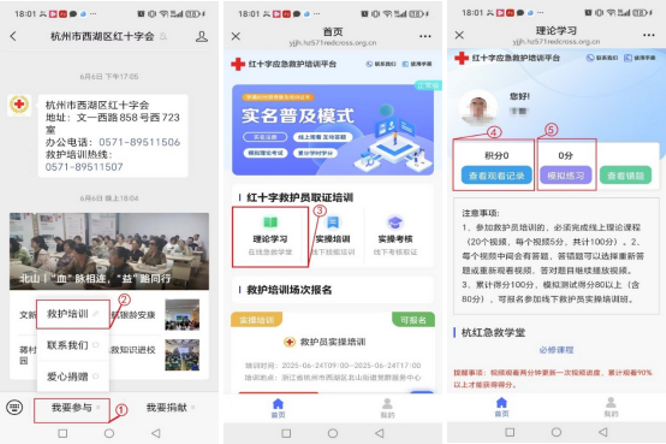 1.報名參加培訓的學員須關注“杭州市西湖區紅十字會”官方微信服務號,通過西湖區紅十字會微信公眾號完成在線理論學習和模擬練習,打開“杭州市西湖區紅十字會”官方微信服務號,按順序點擊“我要參與”“救護培訓”“理論學習”。在線觀看急救知識視頻,完成20個必修理論學習,滿100分為合格;模擬練習(考試),80分合格。在線理論學習路徑如圖所示: