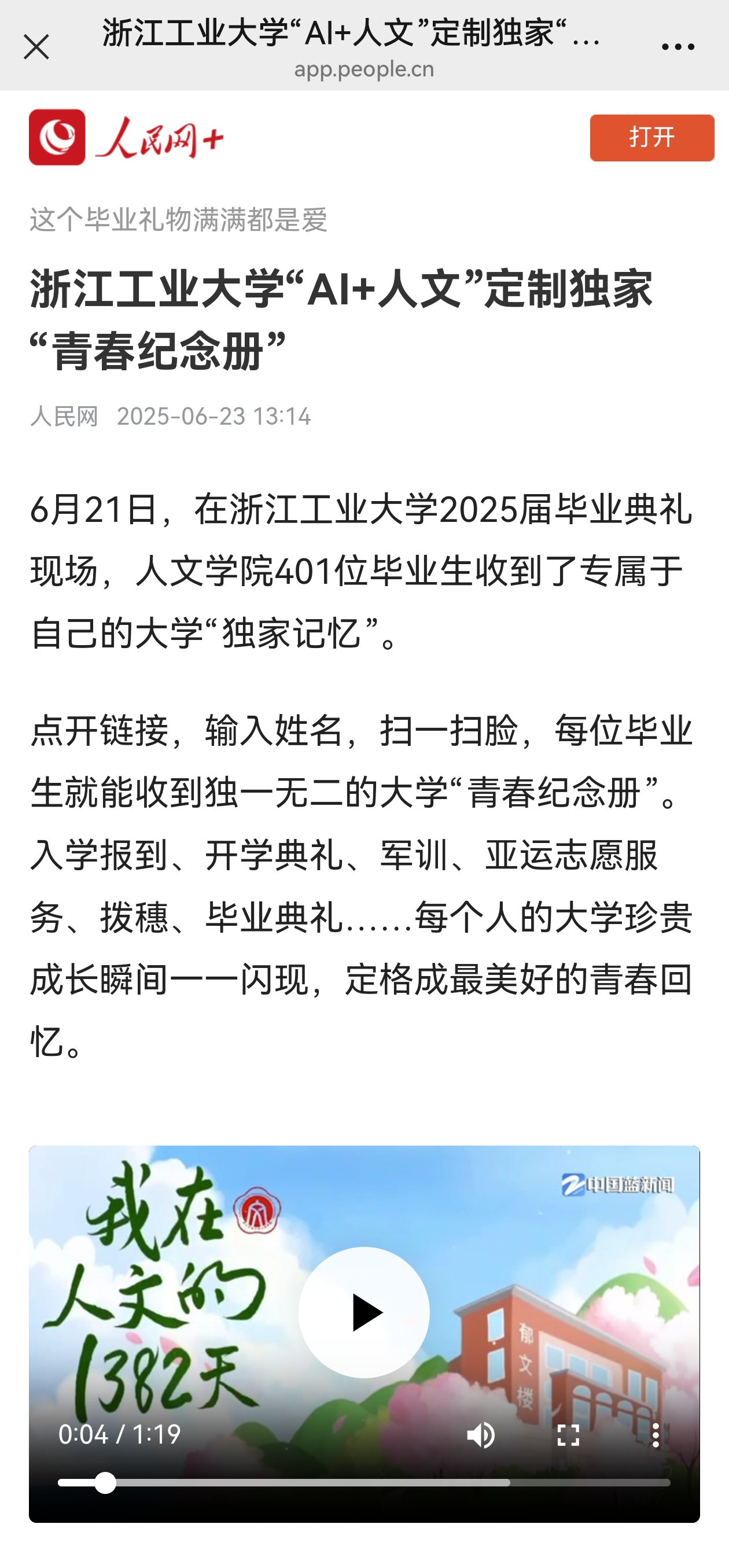 6月21日至23日,人民網(wǎng)等多家媒體報(bào)道我校人文學(xué)院通過(guò)AI剪輯的方式,為401位畢業(yè)生量身定制個(gè)人專屬大學(xué)成長(zhǎng)視頻。