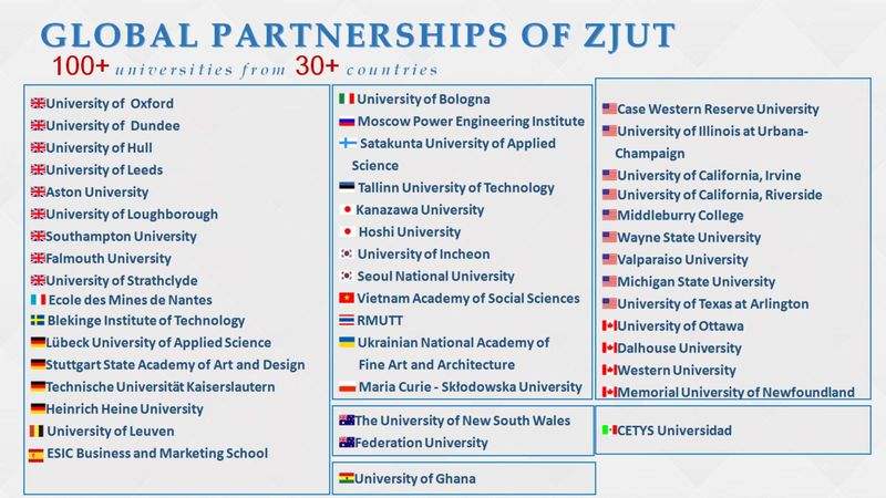 浙江工業大學積極推進與世界高水平大學的合作交流。目前有100多個國際合作伙伴,分布全球30多個國家。